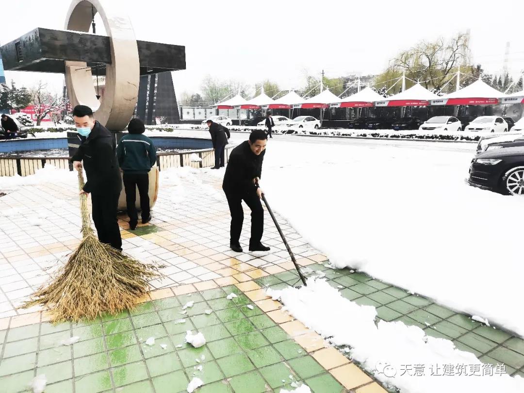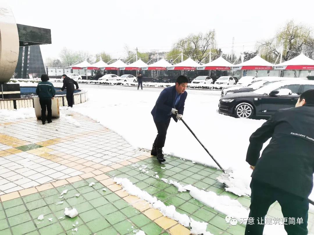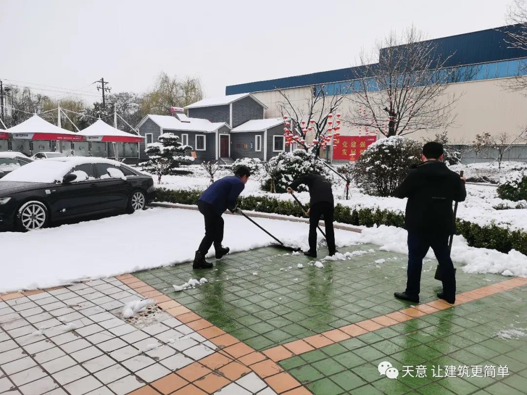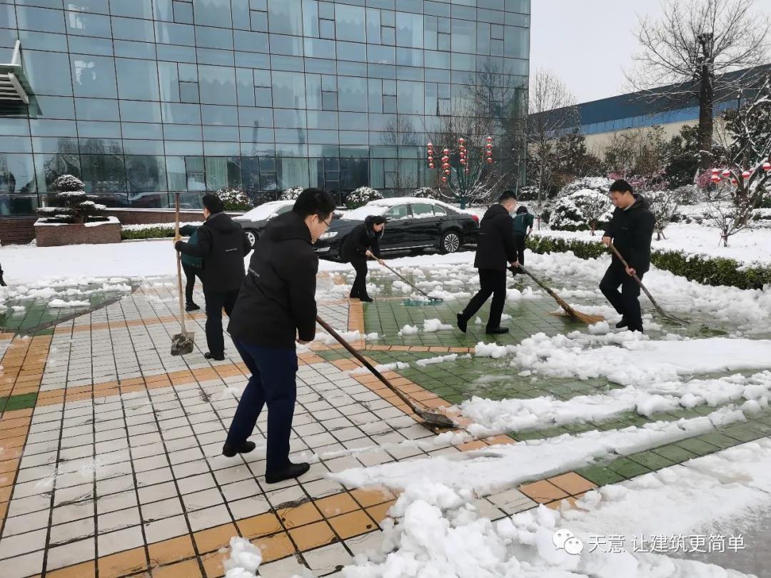 大雪悄然而至,一覺(jué)起來(lái),窗外已是銀裝素裹。然而大雪的降臨也給大家的出行帶來(lái)諸多不便,公司大門口、辦公樓前的道路都被皚皚白雪覆蓋。早晨上班前,公司總經(jīng)理劉海龍、營(yíng)銷總監(jiān)郭川東帶領(lǐng)公司員工拿起掃帚鐵锨,滿懷激情,投入除雪當(dāng)中。整個(gè)除雪作業(yè)過(guò)程井然有序,熱火朝天,干勁十足,大家不懼寒冷,不怕手凍。鐵锨和地面的碰擊聲、掃帚清掃雪花的刷刷聲,不一會(huì)兒辦公樓前的積雪已蹤影全無(wú),所到之處,雪沒(méi)了,路干凈了,掛滿枝頭的冰凌隨風(fēng)婆娑起舞,點(diǎn)頭稱贊,大家的心中更是無(wú)比的欣慰,雖然凍紅了臉、累出了汗,但累并快樂(lè)著。